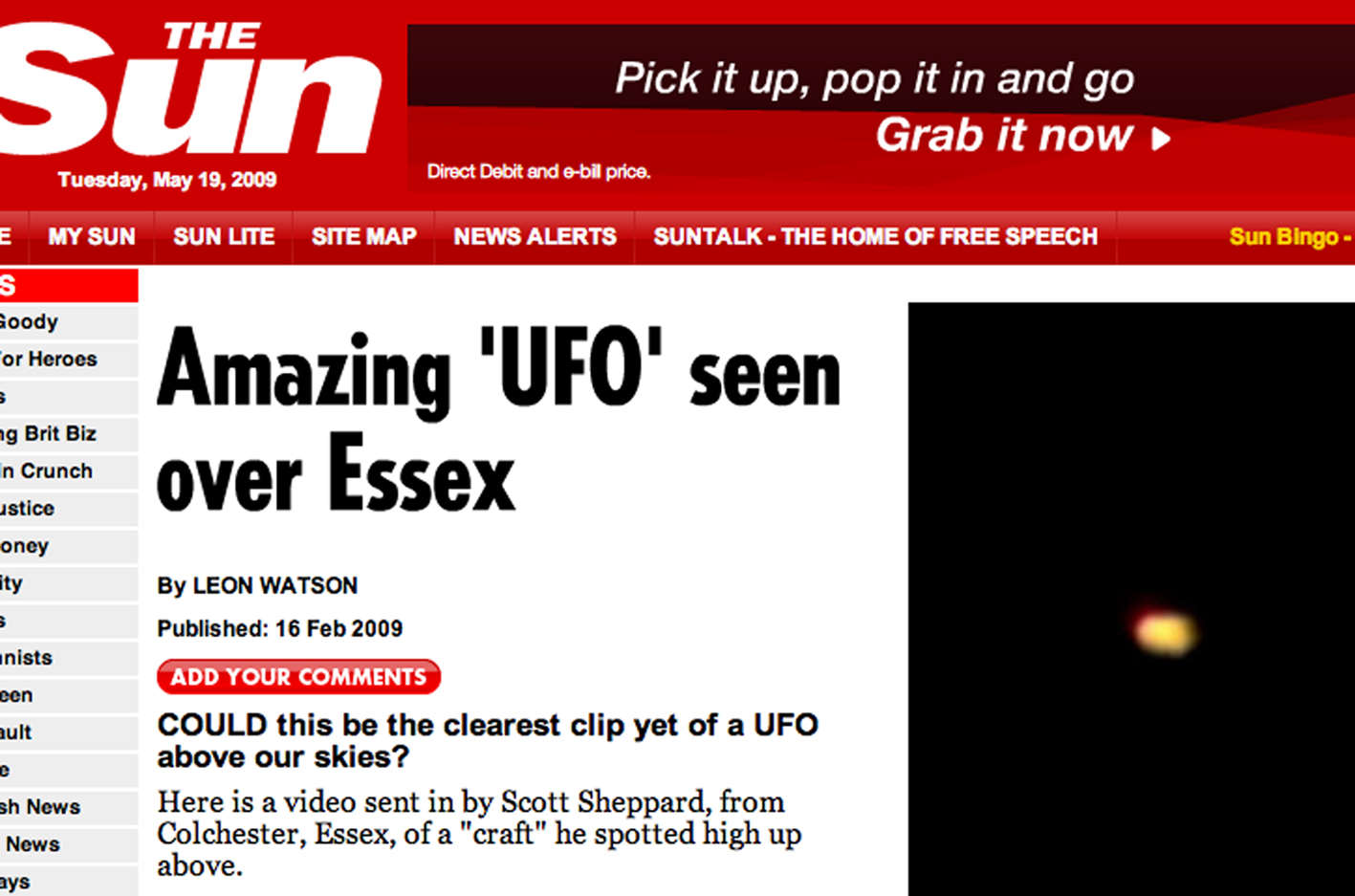 Η εφημερίδα The Sun περιέλαβε μια αναφορά από τον Scott Shepperd για ένα λαμπρό φως ή «σκάφος» που παρατήρησε πάνω από το Colchester, στο Essex. Τράβηξε και ένα βίντεο το οποίο διατίθεται στην ιστοσελίδα της εφημερίδας. Ο Shepperd ήταν στον κινηματογράφο μαζί με έναν φίλο του προτού δει το εκθαμβωτικό φως στον ουρανό. Είπε: «Όπως ήμουν έτοιμος να μπω στο αυτοκίνητο για να πάω σπίτι, μου τράβηξε την προσοχή μια χρυσή σφαίρα φωτός που ήταν πάνω από εμένα σε ύψος όχι μεγαλύτερο από 35 μέτρα. Είπα στον φίλο μου να το κοιτάξει, με αγνόησε και είπε ότι πιθανώς είναι απλά ένα αεροπλάνο. Του ζήτησα να το δει όπως και να ‘χει και, ακριβώς τη στιγμή που το έκανε , αυτό άρχισε να κινείται από επάνω μας πιο πέρα. Ήταν πολύ φωτεινό και πορτοκαλί και μετακινούταν πολύ ήσυχα: Δεν είχε κάποιο φως που να αναβοσβήνει, πράγμα που με έκανε να αμφιβάλω ότι ήταν αεροπλάνο. Όσο πιο γρήγορα μπορούσα έβγαλα το κινητό μου τηλέφωνο για να το κινηματογραφήσω αλλά ώσπου να το βγάλω και να το ρυθμίσω, είχε ήδη μετακινηθεί αρκετά μακριά.»
