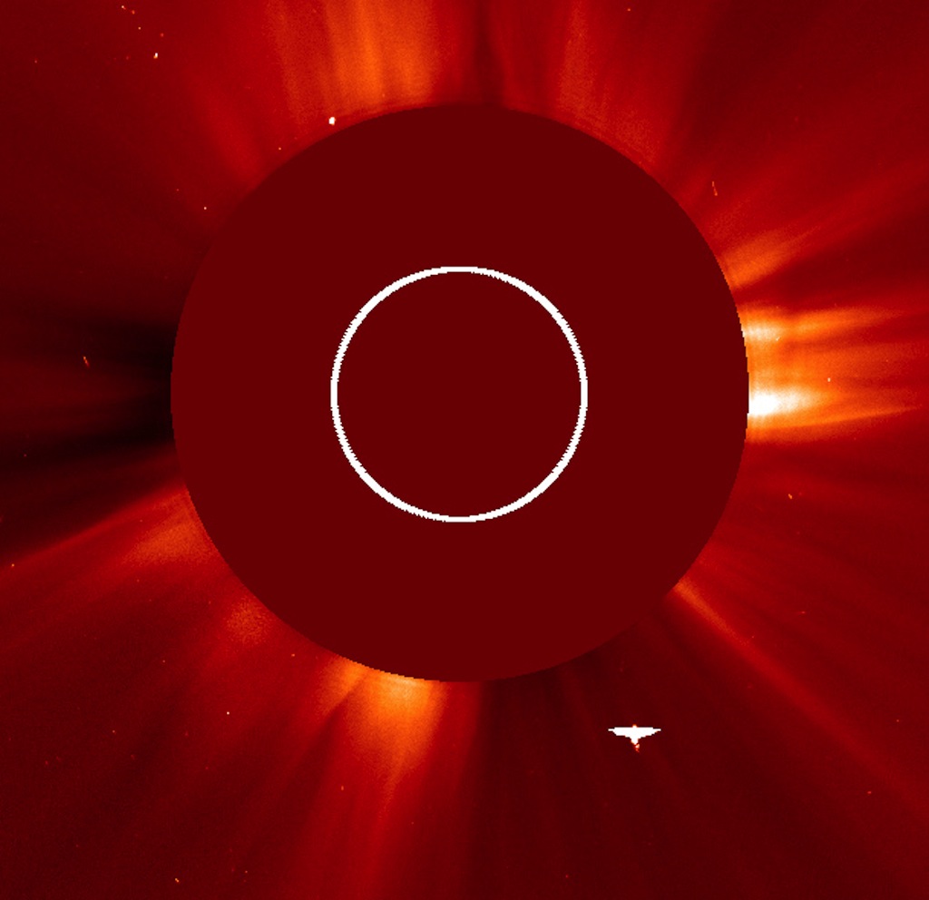 [Στμ: μπορείτε να δείτε τη φωτογραφία σε πλήρη ανάλυση εδώ, που είναι η επίσημη βάση δεδομένων του SOHO near realtime data. Σημειώνουμε ότι ο δορυφόρος SOHO