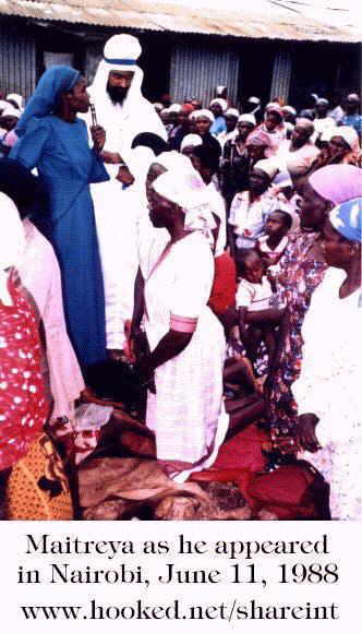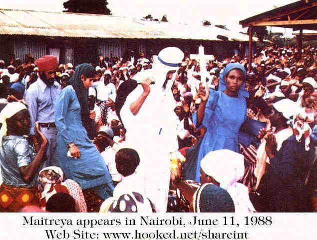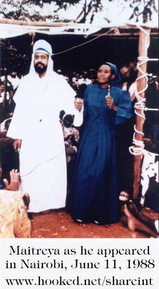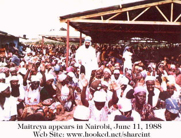 Ο Μαϊτρέγια όπως εμφανίστηκε μπροστά σε χιλιάδες έξω από το Ναϊρόμπι τον Ιούνιο του 1988. Εμφανίζεται με διάφορες μορφές σε διάφορες ομάδες και άτομα – αλλά πάντα με μια μορφή που εμπνέει αναγνώριση. Το συμβάν δημοσιεύτηκε στην εφημερίδα Kenya Times και αναμεταδόθηκε από μεγάλα διεθνή μέσα ενημέρωσης.